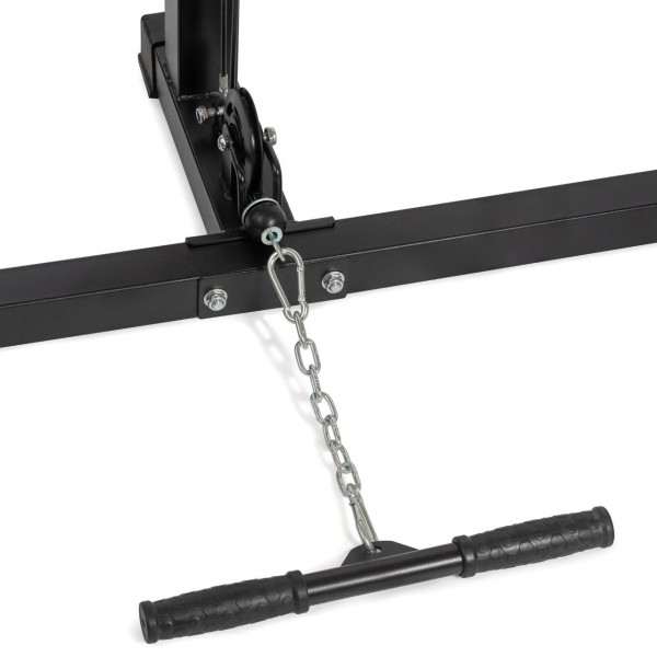 Конструкция из прочного стального профиля включает держатели для дисков 51 мм и прорезиненные опоры. Поставляется с ручками для верхней и нижней тяги.