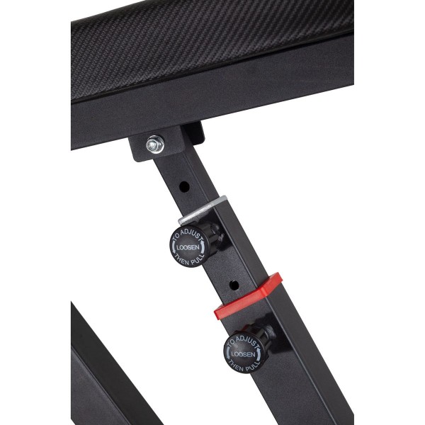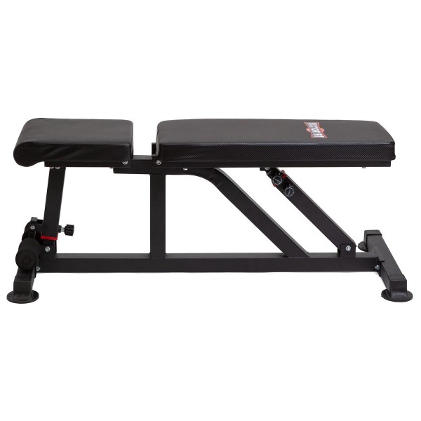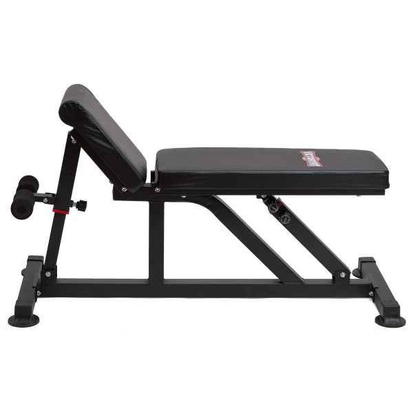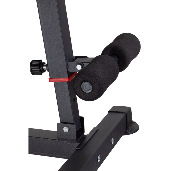 Спинка скамьи может быть установлена под разными углами (11 положений, 0-90 градусов). Есть три варианта положения сидения. Модель рассчитана на спортсмена весом до 140 кг.