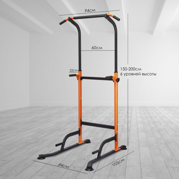 Турник имеет 6 положений высоты (150-200 см). Ширина между брусьями 60 см.