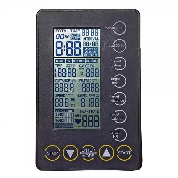 Консоль отображает характеристики заезда на экране. Есть функция Smart Connect (Bluetooth/ANT+) для подсоединения дополнительных ресурсов. Также предусмотрены: