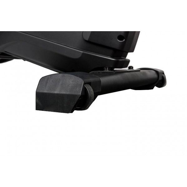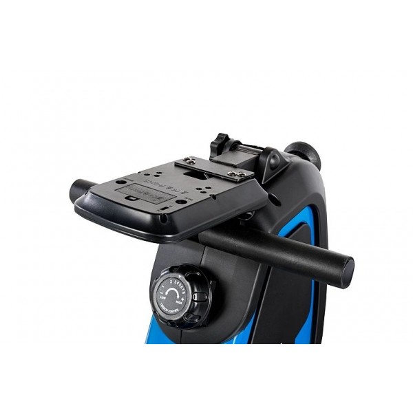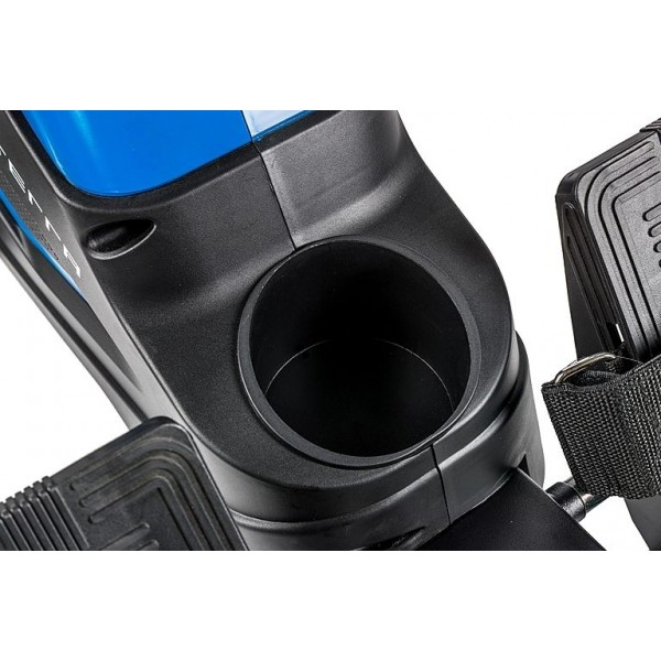 Тренажер имеет ролики для перемещения и подставки для бутылки и планшета.