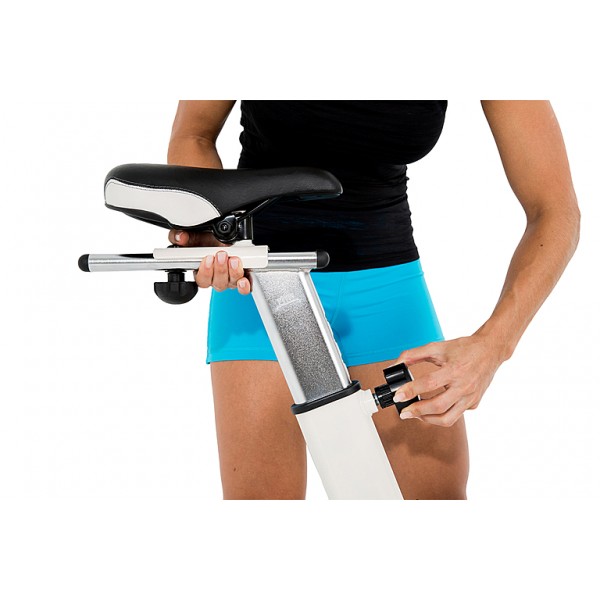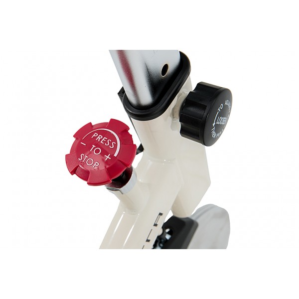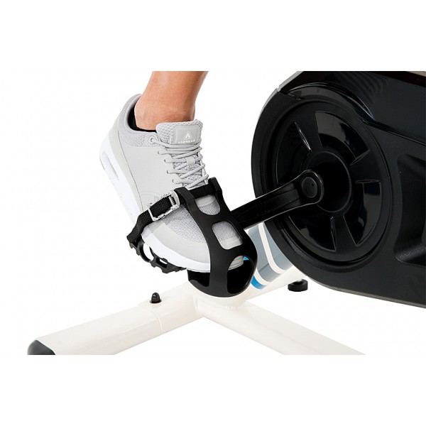 Колодочная нагрузка регулируется плавно вручную. Тренажер работает тихо и не требует смазки. Установлен тяжелый сбалансированный маховик 22 кг. И сидение, и руль настраиваются в двух плоскостях. Специальные рельефные вставки надежно фиксируют ноги спортсмена. Тренажер имеет ролики для перемещения.